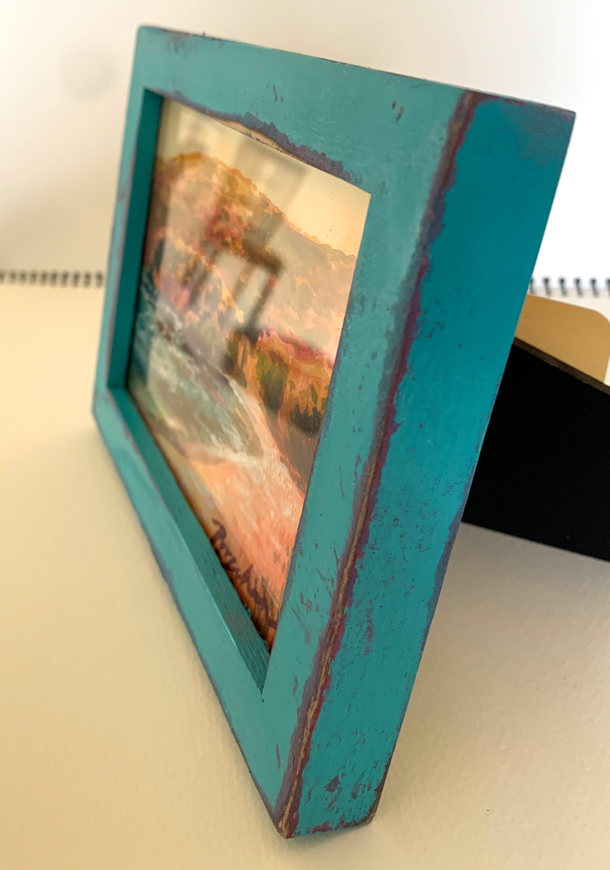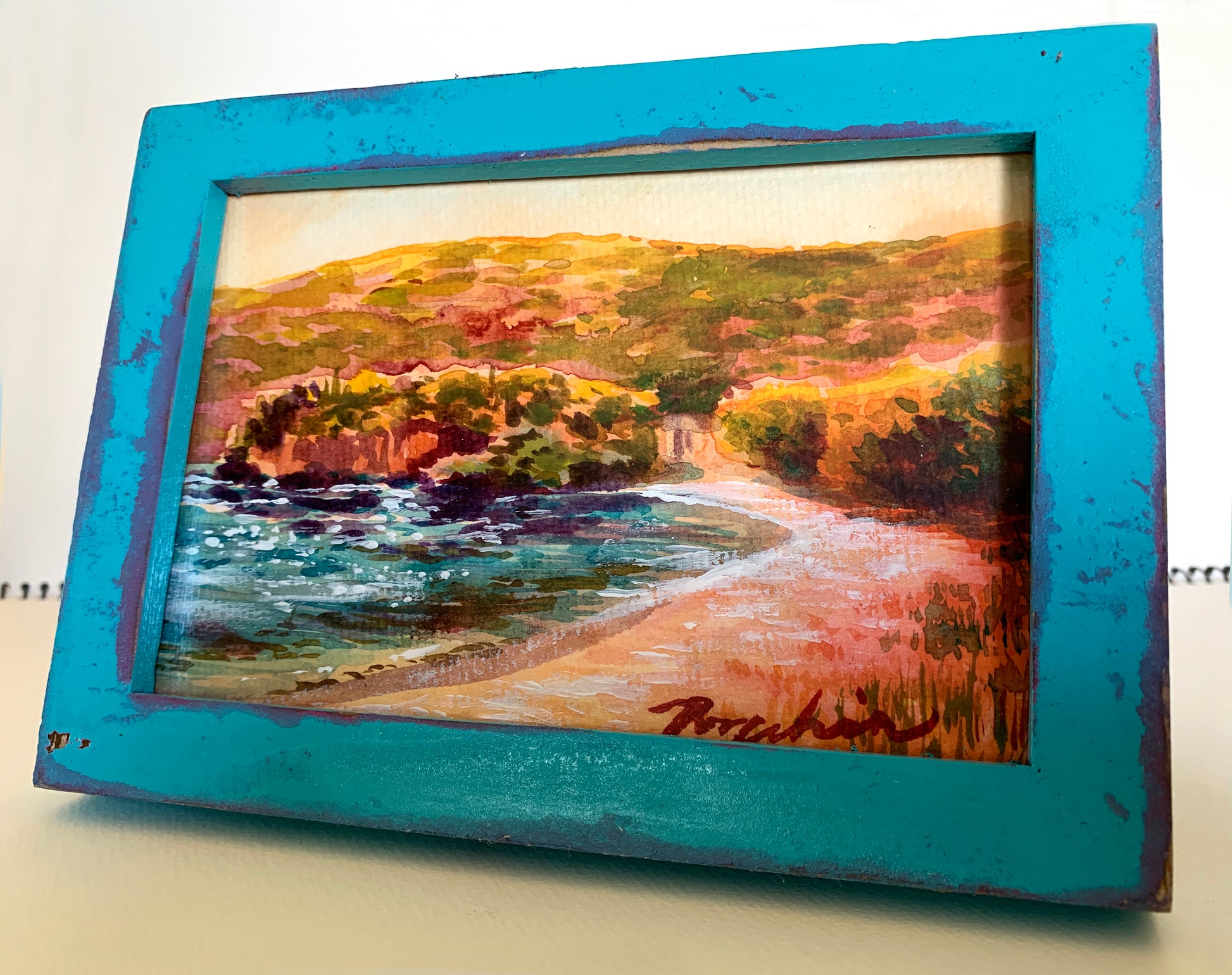 I finished this piece with the final touches of light on the water and on the beach leading up to the Salt Pond Bay trail and sign my name. The Watercolor paper is delicate and getting it to the art studio safely to frame it is my final task. I paint a frame with several coats of different colored paint that I distress with sandpaper and the image is safely displayed under glass.